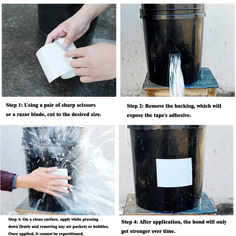 The waterproof tape can be used on just about any material, including PVC, acrylic, metal, wood, ceramic, glass, rubber, fiberglass, stucco, plaster, stone, and drywall. It also works under water and can be applied hot or cold.